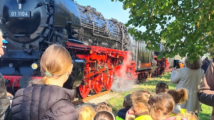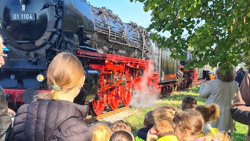 Am 01. Oktober 2025 hielt auf Ihrer Durchreise eine Dampflok in Langenlonsheim. Die Lok musste mit frischem Wasser aufgefüllt werden, was die örtliche freiwillige Feuerwehr übernommen hat. Diese Chance konnten sich die Kinder der Bärengruppe nicht entgehen lassen und machten sich gemeinsam auf den Weg. So konnten sich alle das Spektakel ganz aus der Nähe anschauen und eine echte Dampflok hautnah erleben. Bei strahlendem Sonnenschein konnten alle den kleinen Ausflug richtig genießen!