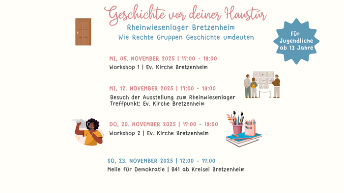 Wir bereiten uns mit 2 Workshops und dem Besuch zur Ausstellung zum Rheinwiesenlager auf die Meile für Demokratie am 23. November vor. Die Ergebnisse wollen wir in einem Stand präsentieren.