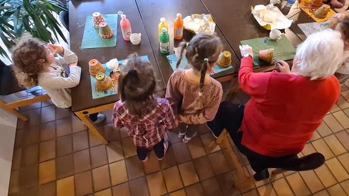 Die Krankheitswelle hat das Zusammentreffen zwar ein wenig verzögert, doch gelungen ist es doch! Gemeinsam mit 4 Senior:Innen aus dem Seniorenzentrum Langenlonsheim haben die Vorschulkinder Vogelfutter für den Winter hergestellt. Unter Anleitung von Frau Dilly und Herrn Christ haben alle gemeinsam Tontöpfe bemalt, das Vogelfutter hergestellt und in die Tontöpfe damit befüllt. Alle Beteiligten hatten sehr viel Spaß.