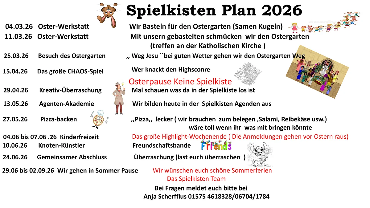 Der Spielkiste-Plan wird alle sechs Monate herausgegeben, sodass Eltern und Kinder rechtzeitig über die kommenden Aktivitäten, Veranstaltungen und Freizeitangebote informiert sind.